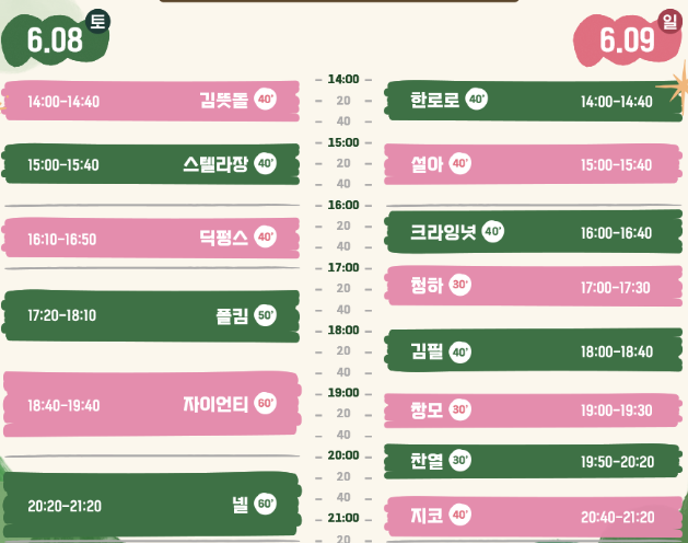 먼저, 케이-팝 공연은 친구·연인 등과 잔디밭에서 하루 종일 음악과 음식을 즐기는 대규모 뮤직 페스티벌 형식으로 이틀 동안 오후 2시부터 밤 9시까지 진행된다. 케이-팝 뮤지션 14명(8일 6명, 9일 8명)이 출연한다.