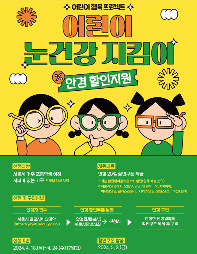 서울 어린이 눈건강 지킴이 사업’은 서울시가 민간기업과 협력해 서울 거주 초등학생 이하 어린이들에게 눈 검진(시력검사)과 안경 구입 시 최대 20%의 할인을 지원하는 사업입니다.