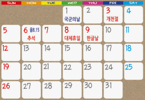 이번 설날 연휴가 임시공휴일로 지정될지 아무도 몰랐잖아요. 그러다 보니, 긴긴 연휴에 어디 못 간 분들이 아쉬워 하고 있어요. 아시다시피, 다가오는 추석 달력 보시면, 10월 10일 하루만 휴가를 낸다면 총 10일간 쉴 수 있는 긴 휴가가 기다리고 있습니다. 혹시나 이번 연휴가 아쉬운 분들.. 빨리 서둘러 예약하시는게 좋겠죠?
