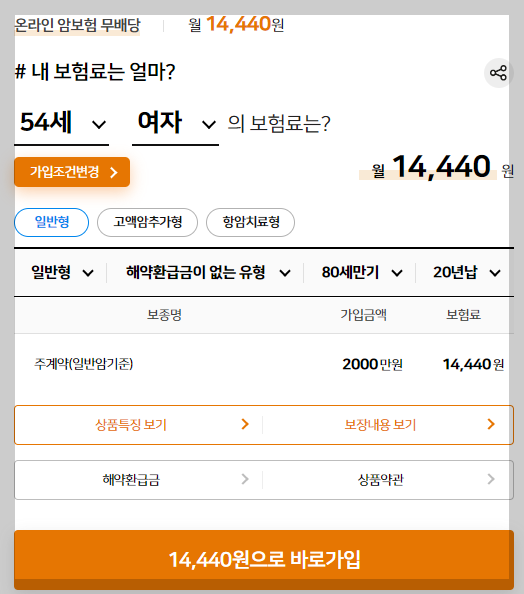 아래처럼 50대 여자의 암보험료는 월 14,440 원이 나왔네요.