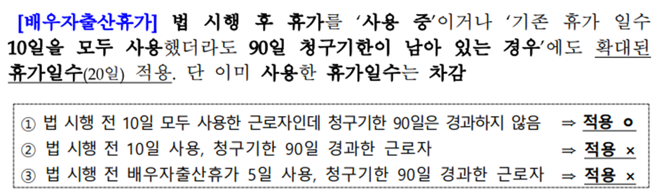 - 종전 : 10일, 1회 분할 사용, 출산일로부터 90일 이내 청구, 정부급여지원(*중소기업 근로자 5일, 최대 약40만원)
