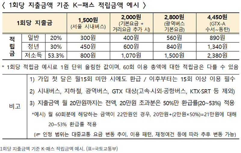 K-패스로 대중교통을 월 15회 이상 이용하는 만19세 이상 성인은 월(매월 1일~말일) 최대 60회분에 해당하는 대중교통비의 20~53.3%를 적립해 다음 달에 환급받을 수 있습니다. 적립률은 일반(만 35세 이상) 20%, 청년(만 19~34세) 30%, 저소득(기초생활수급자·차상위) 53.3%로 상이합니다.